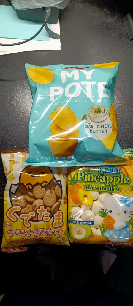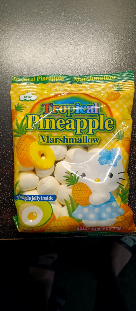 so i got these chips they were ok, I hardly tasted the garlic they was like plain lil bit but I would eat them again These are like lil wafers cookies they small and round and taste good taste just like wafer cookies and very very crunchy These tropical marshmallows is so good they are small and round and wen u eat the middle it’s a burst of pineapple jelly in the middle bring the flavor These were a pretty good snack, out of the 3 if I had to just pick one I would say the marshmallows even tho they make me so thirsty lol but if u can try something different and try other countries foods or at least snacks.